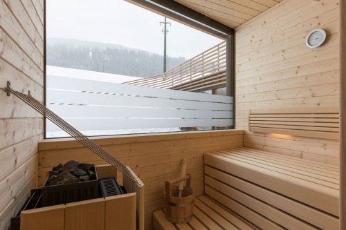 sauna, 2 sociální zařízení, balkon; maximální obsazenost apartmánu jsou