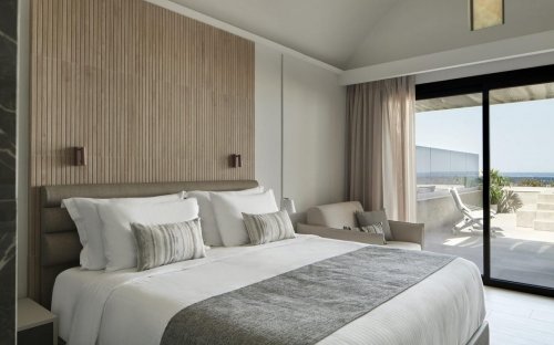 Hotel s celkovou kapacitou 172 pokojů nabízí ubytování několika kategorií. Všechny pokoje jsou moderně a velmi elegantně zařízené, mají sociální zařízení se sprchou nebo vanou, vysoušeč vlasů, pantofle a župany, hygienické sety, individuální klimatizaci, SAT/TV, telefon, WiFi připojení, coffe/tea set, minilednici, pracovní desk, balkón nebo terasu. Pokoje se dělí na kategorie: Standard (28 m2, kapacita 2–3 osoby) s výhledem na bazén nebo na moře anebo se sdíleným bazénem, dále Superior (28 m2) s vlastní vířivkou a výhledem na moře, dále suity Junior (35 m2, kapacita 2–3 osoby) s bočním výhledem nebo sdíleným bazénem nebo s umístěním v první linii u pláže. Na vyžádání lze sjednat pokoje s bezbariérovými přístupy.