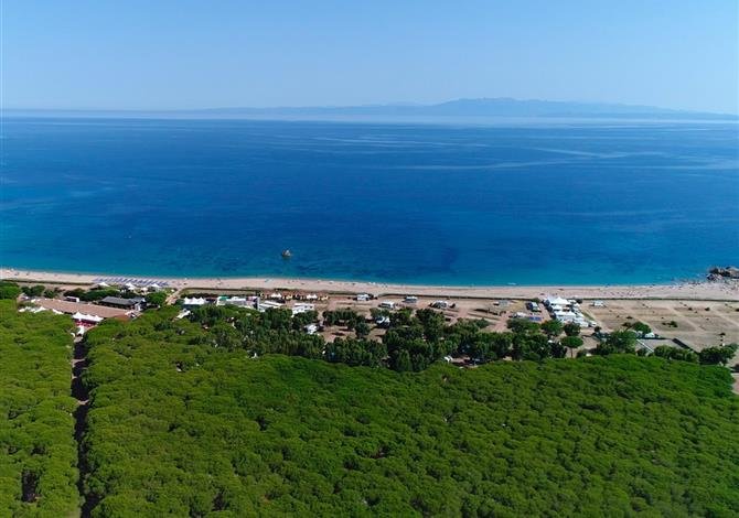 široká písečná pláž s plážovými bary, lemovaná drobnými útesy. Vstup do moře je pozvolný, možnost plážového servisu. FKK pláž vzdálena 3 km.