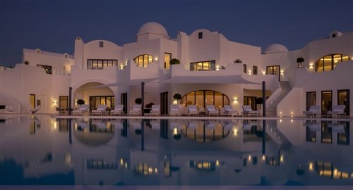 mistrovsky kombinuje středomořskou atmosféru Santorini s jemným arabským