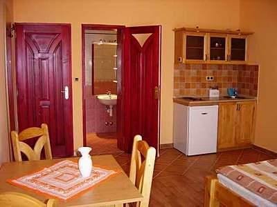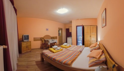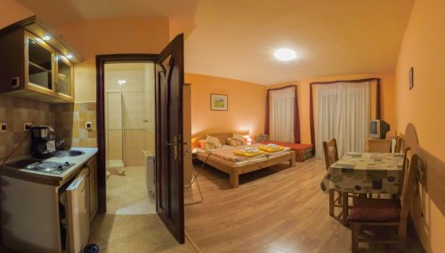 1 až 3.lůžkové apartmány jsou vybaveny TV/SAT- čt 24, kompletně vybavennou kuchyňkou, ledničkou, topinkovačem, vším potřebným k vaření a stolování, balkonem, sociálním zařízením