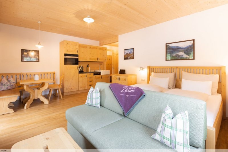 - obývací místnost na spaní s kuchyňskou linkou, dvoulůžkem, pohovkou na spaní a TV