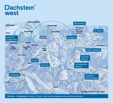 Lyžařská oblast Dachstein West patří mezi největší a nejrozmanitější areály v Salcbursku a Horním Rakousku. Skipas pokrývá nejen hlavní areál Dachstein West, ale i přilehlé oblasti Dachstein Krippenstein Obertraun, Feuerkogel v Ebensee, Karkogel a Sonnleitenlifte v Abtenau, Lammertal Lungötz, St. Martin am Tennengebirge a Zinkenlifte – Bad Dürrnberg. Celkem tak nabízí až 160 km perfektně upravených sjezdovek vhodných pro všechny – od rodin s dětmi po zkušené lyžaře.