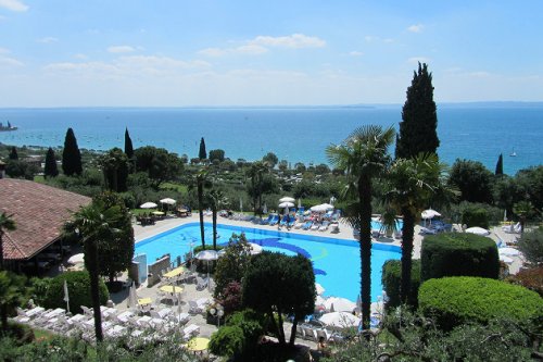 s výhledem na jezero, obklopené zelenými vinicemi a olivovými stromy.