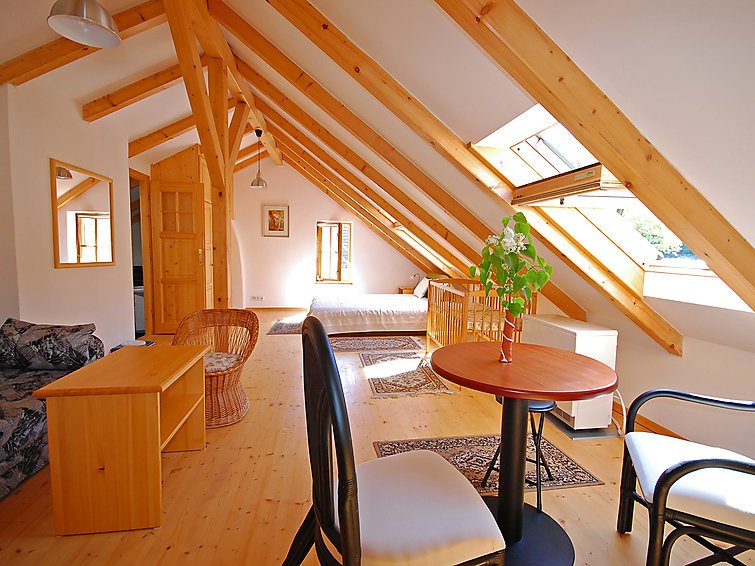 2-pokojový řadový dům 60 m2 na 2 podlažích. Částéčně zkosený, velmi pěkné a moderní zařízení: obývací pokoj/jídelna s 2× lůžko, otevřený krb, TV-satelit a rádio. Kuchyňský kout (4 plotýnky, trouba, mikrovlnka). Sprcha/WC. E-topení, topení dřevem. V horním patře: zkosen 1× dvoulůžkový pokoj 20 m2 s koupelna/WC. Terasa. Odkládací místnost. K dispozici: pračka, žehlička. Internet (Wireless LAN [WLAN], zdarma). Pozor prosím: nekuřácký byt.