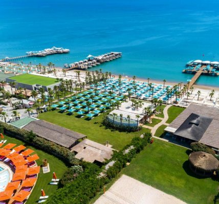 Areál luxusního 5* hotelu (v provozu od roku 2014) se rozléhá na pozemku o celkové rozloze více než 170 000 m2. Zcela právem se řadí mezi ,,top hotely,, v turistické oblasti Turecká riviéra. Pyšní se nejen obrovským prostorem obklopeným vzrostlou přírodní zelení, rovněž tak i skvělou polohou u dlouhé a široké písečné pláže (Modrá vlajka), která je v přilehlé části (400 m) soukromá a patří k hotelu, stejně tak i unikátní velké plovoucí molo s pavilónky (1 500 m2) a vstupy do moře. Na výjimečnosti hotelu se podílí také přilehlé golfové hřiště (18 jamek, noční osvětlení) a bezpochyby i velká řada hotelem nabízených atrakcí. Díky své poloze hotel skýtá také snadnou dostupnost řady zajímavých okolních míst této lokality. Snadno tak můžete navštívit městečko Belek (2 km), tradiční vesnici Kardia (3 km), tematický park The Land of Legends (3 km) nebo hlavní město oblasti Antalya s nespočtem historických a turistických zajímavostí (30 km, rovněž tak mezinárodní letiště, doba transferu cca 35 min.).