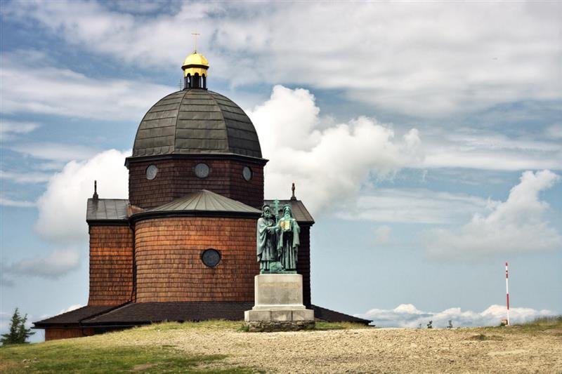 vrcholu pak sousoší sv. Cyrila a Metoděje, kaple z roku