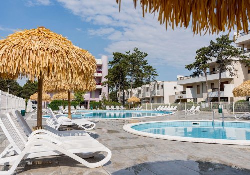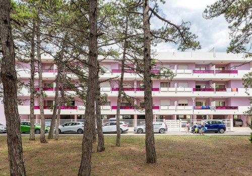Rezidenční budova s apartmány je vybavena výtahem a pro každý apartmán je k dispozici jedno parkovací místo. Součástí rezidence je bazén pro děti a dospělé (otevřeno v závislosti na počasí), zahrada, dětské hřiště, wi-fi (jen ve společných prostorách a provoz je limiotván). Všechny apartmány jsou zrekonstruované a moderně zařízené a vybavené příslušenstvím, klimatizací, SAT/TV, kávovarem, mikrovlnou troubou, a balkonem.Apartmán pro 4 osoby (AP4) – plně vybavený kuchyňský kout, obývací pokoj s rozkládací pohovkou pro 2 osoby, ložnice s manželským lůžkem, příslušenství, klimatizace, balkon. Apartmán pro 6 osob (AP6) – plně vybavený kuchyňský kout, obývací pokoj s rozkládací pohovkou pro 2 osoby, ložnice s manželským lůžkem, ložnice se dvěma samostatnými lůžky, příslušenství, klimatizace, balkon.