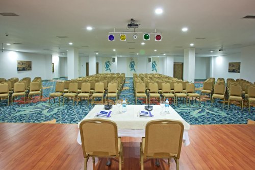 Rozlehlý hotelový komplex tvoří několik 1–3patrových budov bílé barvy, v centrální části pak areál bazénů, který ve své přední části přechází v pláž. Uvítá Vás vstupní hala s recepcí a lobby, o stravování se postarají 2 restaurace (hlavní bufetová a a´la carte restaurace Poseidon s venkovní terasou), k posezení a občerstvení pak pasticerie, lobby bar, pool a beach bary. Ve vnitřních prostorách dále najdete společenskou místnost, internetový koutek (Wi-Fi připojení ve společných prostorách zdarma), kongresový sál (kapacita až 250 osob), hernu, obchůdky, kadeřnictví, dětský kout aj. Zajisté potěší hotelové Spa centrum s vnitřním bazénem, saunou, tureckou lázní, masážemi, beauty centrem a také výborně vybavené fitness centrum. Venkovní areál nabízí velký sladkovodní bazén nepravidelných tvarů, samostatný dětský bazén, sluneční terasy s lehátky a slunečníky (zdarma, i na pláži, osušky oproti depositu). Pro nejmenší hosty je zde venkovní hřiště s průlezkami a dětský klub s animátory. K aktivnímu odpočinku lze využít tenisový kurt, squash, stolní tenis, biliár, šipky, lukostřelbu, boccia aj., hotel pořádá animační programy (aerobic, vodní pólo, volejbal aj.), na pláži lze využít služeb centra vodních sportů nebo potápěčské báze.