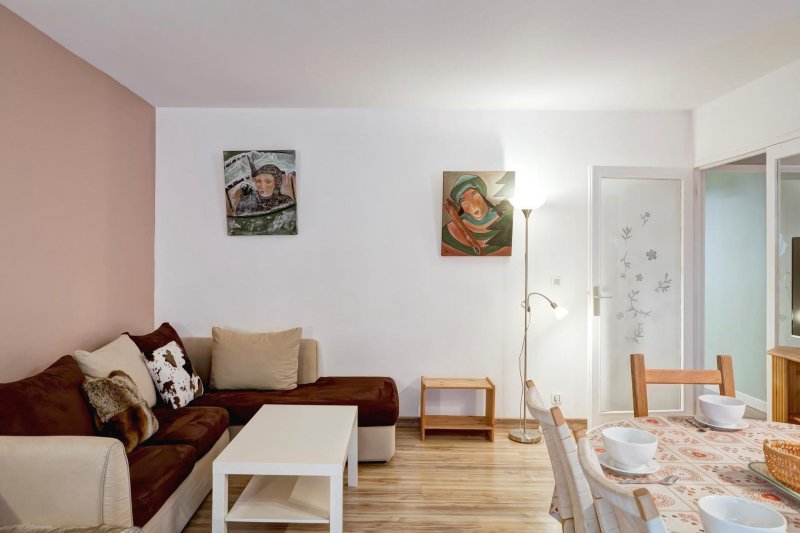 - obývací místnost na spaní: rozkládací pohovka pro dva stejně jako jídelní prostor, kuchyňská linka, sedací kout a TV
