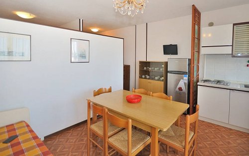 Bilo B-7 pro 7 osob – obývací pokoj s dvougaučem a kuchyňským koutem, oddělená část s manželskou postelí a jedním lůžke, (není oddělena dveřmi, ale jenom částečně stěnou, která nedosahuje ke stropu), 1× ložnice s palandou, sociální zařízení a balkon