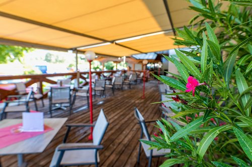 terasa s posezením, lehátky a slunečníky