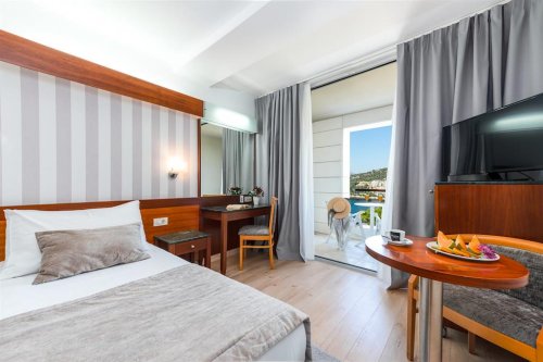 2lůžkové pokoje, sociální zařízení, fén, klimatizace, minibar, SAT TV, telefon a WiFi zdarma. Pokoje jsou s balkonem nebo balkonem na mořskou stranu. Pokoje s přistýlkou jsou na vyžádání.
