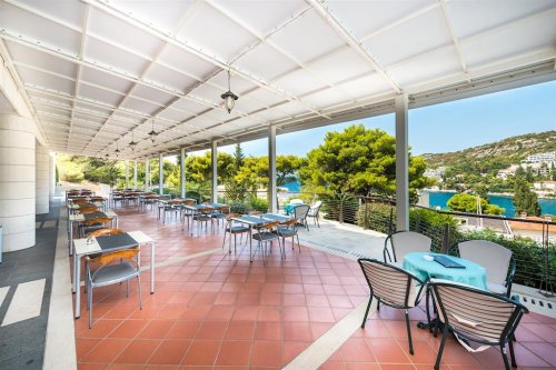 Hotel se nachází v zeleni na poloostrově Lapad, cca 4 km severně od Dubrovníku. Pláž je oblázková, vzdálená cca 100 m od hotelu. V okolí jsou i pláže částečně oblázkové a kamenité s betonovými platy. Lehátka a slunečníky jsou za poplatek.