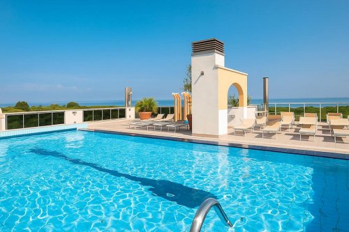 Tento nedávno postavený čtyřhvězdičkový hotel v letovisku Eraclea Mare se nachází v blízkosti moře (cca 350 m) a piniového háje. Centrum letoviska je vzdáleno cca 100 metrů a najdete tam několik obchodů, barů a restaurací, autobusová zastávka je vzdálena cca 100 m od hotelu. Hotel nabízí recepci (v provozu cca od 7.30 hod. do 22.00 hod.), restauraci, bar, Wi–Fi připojení zdarma, výtah, bazén s panoramatickým výhledem a s lehátky a slunečníky (k dispozici dle dostupnosti a podmínek počasí). Hostům je k dispozici zdarma vstup do wellness centra s tureckými lázněmi, zážitkovou sprchou a saunou. Dále fitness centrum k dispozici, parkovací místa ve vzdálenosti cca 100 m od hotelu za poplatek cca 10 €/den (omezená kapacita, nelze rezervovat, platí se na místě). V hotelu se nachází 110 pokojů, má 7 pater a k dispozici je výtah. Pobyt s domácími mazlíčky malého vzrůstu (do 10 kg) je povolen za poplatek cca 10 €/den a většího vzrůstu (mezi 10 kg a 20 kg) za poplatek cca 20 €/den (hradí se na místě). Pro pobyt s malými dětmi je možné zapůjčit za poplatek cca 10 €/den dětskou postýlku, dětská židlička v restauraci k zapůjčení zdarma. Hotel akceptuje platby platebními kartami Eurocheque, Visa a Mastercard.
