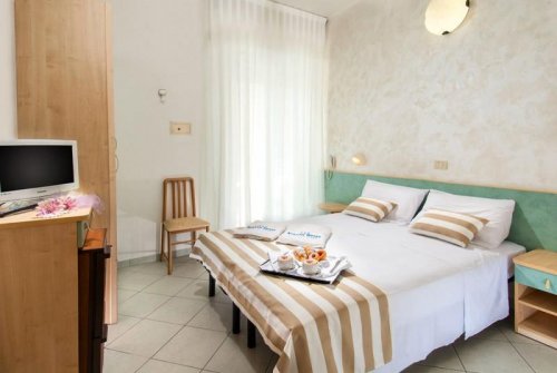 Hotel se nachází jen pár kroků od pláže a také přímo v centru města (cca 350 m od veřejných malebných zahrad). Obchody, restaurace a bary jsou v docházkové vzdálenosti cca 50 m. Kromě recepce hotel disponuje restaurací, barem, společenskou místností s TV, výtahem, miniklubem pro děti, kde se pořádají animační programy cca na 2 hod./denně, WiFi připojením po celém hotelu zdarma a parkovištěm vzdáleném cca 1,5 km od hotelu za poplatek 5 €/den (platba na místě, omezená kapacita). K parkovišti jezdí kyvadlová autobusová doprava. Domácí mazlíčci (malá plemena) jsou zde povoleni na vyžádání u CK a za poplatek 30 €/pobyt (platba na místě). Hotel svým hostům nabízí celkem 41 pokojů na 4 patrech.