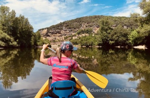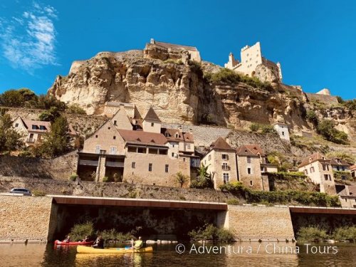 kanoích na řece Dordogne, s výhledy na okolní hrady