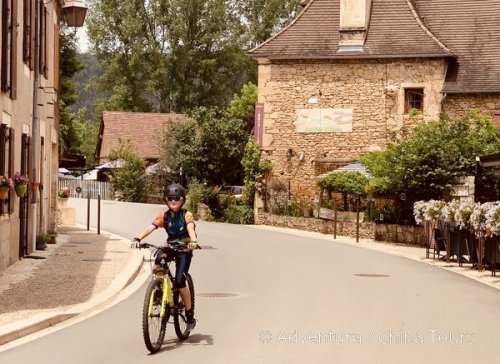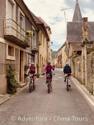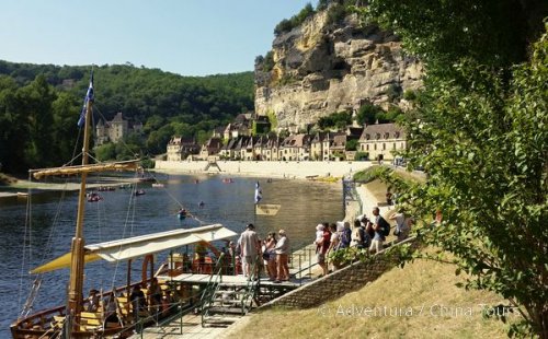 Na kole do údolí řeky Dordogne, jemuž dominují skalní hrady a zámky: La Roque-Gageac (řazena mezi nejkrásnější vesnice Francie), na skále nad řekou tyčící se Beynac (středověký hrad z 12. století), katarský hrad Castelnaud-la-Chapelle (založený sektou albigenských ve 13. století), zámek Les Millandes (sídlo Josephine Bakerové), rozlehlé francouzské zahrady u zámku Marqueyssac; možnost návštěvy muzea ořechů a lanýžárny či dojezdu do kempu (47–60 km).