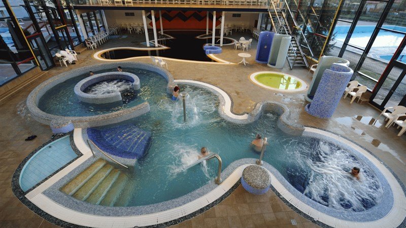 V hotelu: krytý zážitkový bazén 34 – 36°C, krytý termální bazén 34 –36°C, krytý bazén s protiproudem (17 m) 28 –30°C, dětský bazén 34–36°C, venkovní bazén 24–26°C Provoz od cca května do září, dle počasí), venkovní termální bazén 36 –38°C