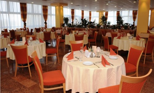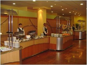 polopenze – snídaně i večeře formou bufetu V hotelu je hostům k dispozici bar a restaurace pro 300 osob – nabídka maďarských, diabetických a vegetariánských pokrmů – s bufetovou snídaní a večeřemi.