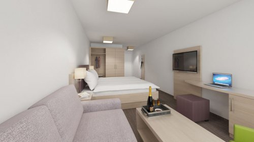 Dvoulůžkové pokoje Krokus (30 m2) s gaučem pro 1–2 osoby.