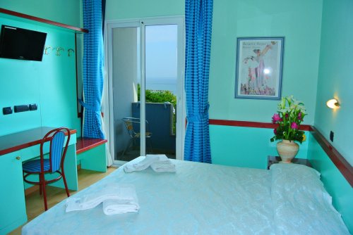 Pokoje Exclusive pro 2 dospělé a 1–2 děti (R3C a R4C) – dvoulůžko a přistýlka/ gauč nebo palanda, výhled na moře.