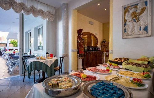 hotel leží 2 min pěšky (50 m) od privátní pláže v klidné části Rimini – Viserba, obchody 200 m, rušné centrum Rimini 4,5–6 km, letiště Rimini 10 km.