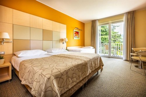 Pokoj o rozloze cca 31 m² s manželským lůžkem (180×200 cm) a rozkládací pohovkou (90×200 cm). Součástí je balkon, vlastní koupelna se sprchou, satelitní TV, telefon, minibar, klimatizace, WiFi, trezor a fén.