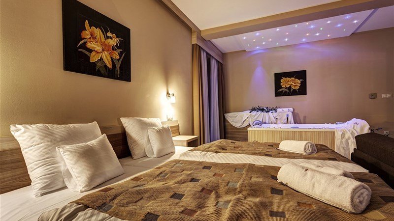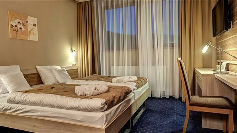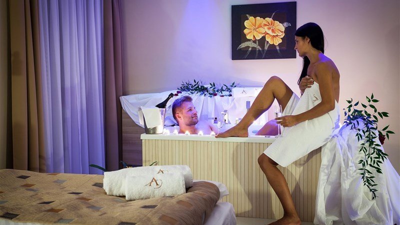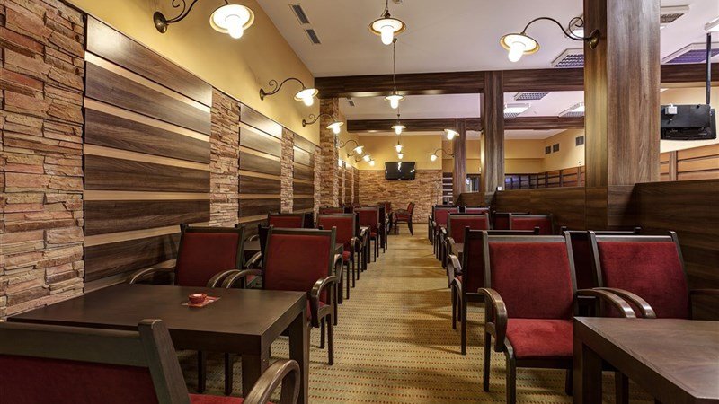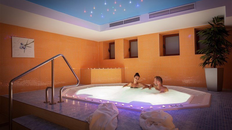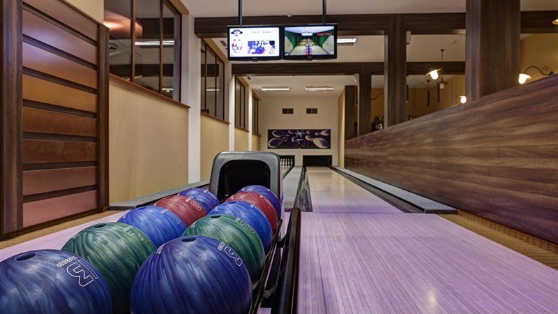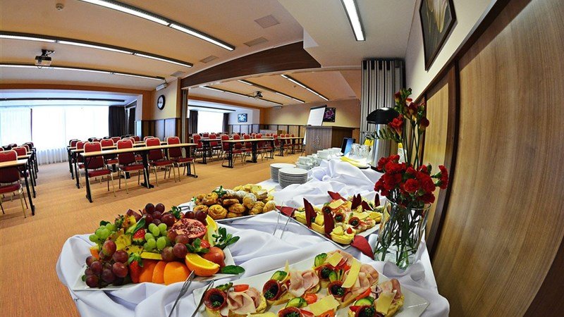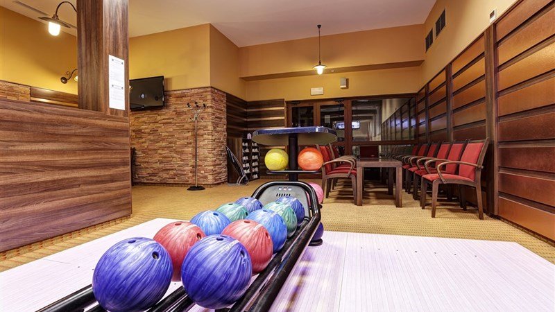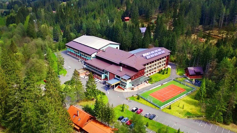 Parkoviště u hotelu, recepce, hotelová restaurace s terasou a krbem, lobby bar, disco bar, altán s kapacitou 70 osob pro posezení u grilu, dětská herna, bowling, půjčovna kol, víceúčelová sportovní hala, víceúčelové sportovní hřiště, fitness & kardiocentrum. Plavecký bazén s protiproudem a 4 drahami a délkou 25 m, okolo bazénu jsou k dispozici lehátka. Hotelové wellness: finská sauna, solná inhalace, bylinková pára, vířivá vana, ochlazovací bazén, přívalová sprcha, vodní cesta – masáž nohou, ledopád, skotské střiky, tropický déšť, tepidárium. Spa procedury za příplatek: anticelulitidní lymfodrenáž, různé zábaly: medový, skořicový, rašelinový, parafinový a pod.