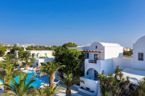 Moderní hotelový komplex s konceptem ADULTS ONLY (pouze pro dospělé) se pyšní skvělou polohou pouhých 5 minut chůze od centra vyhledávaného a turisticky oblíbeného střediska Kamari a zárověň pouhé 2 min chůze od hezké písečné pláže s pozvolným vstupem do moře. Nákupní možnosti se nabízí již v přímém okolí hotelu, samotné centrum střediska skýtá řadu obchodů se suvenýry, taveren, kaváren i barů a dalších turistických lákadel. Za procházku stojí pobřežní promenáda táhnoucí se celým střediskem a také procházka přístavem (6 km). Letiště je od hotelu vzdáleno 3 km.