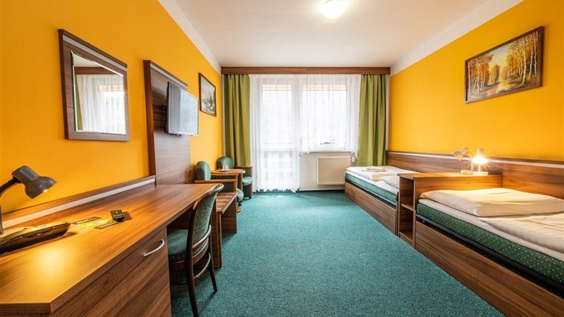 a) 2 – lůžkové pokoje DELUXE v hlavní budově, některé s možností přistýlky (formou pevného lůžka), Spr.+WC, SAT/TV, Wi-Fi, telefon, lednička. Ve většině 2-lůžkových pokojů Deluxe jsou manželská lůžka, ve většině 2-lůžkových pokojů Deluxe s přistýlkou jsou oddělené postele. Na ověření, včetně ceny: b) Rodinné pokoje DELUXE v hlavní budově. Jedná se o dva propojené dvoulůžkové pokoje, v jednom je ještě rozkládací pohovka pro 2 děti do 11,99 let, v druhém pokoji je SAT/TV. Společná koupelna se Spr.+WC, Wi-Fi, lednička. Pokoj s balkonem u všech kategorií ubytování je jako nezávazné přání klienta, bez příplatku za balkón.