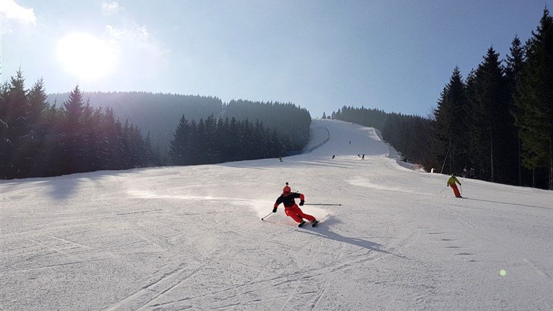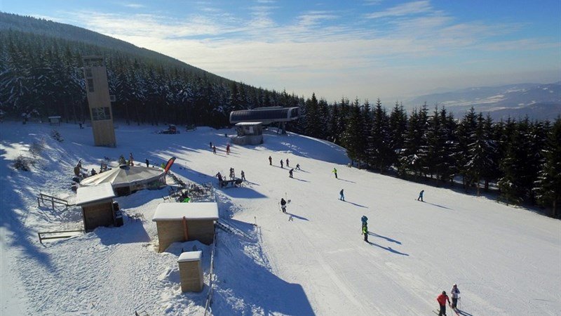U hotelu svah vhodný pro sáňkování a lyžování dětí. Ski areál KAREŠ v Loučné nad Desnou (1 km) – vhodný pro rodiny s dětmi, začínající lyžaře a snowboardisty, 4 vleky včetně dětského, snowpark, snowtubing, pro tělesně postižené zájemce o lyžování možnost výuky na monoski, večerní osvětlení, zasněžování, půjčovna lyží a snowboardů, lyžařská škola, občerstvení najdete přímo pod svahem. Ski areál KOUTY (1,3 km) nabízí nejdelší sjezdovku v Jeseníkách. Nová modrá sjezdovka má délku 3050 m, převýšení 520 m a nadchne hlavně rodiny s dětmi. Ski areál KOUTY – až 1095 m n.m., převýšení až 520 m, celková délka sjezdovek 11,5 km, šestisedačková lanovka o délce 1933 m, první v České republice (u horní stanice lanovky je občerstvení s posezením a toaletami), snowpark, půjčovna lyžařského vybavení, ski servis, lyžařská škola, dětský park, večerní lyžování, upravované běžecké tratě v nadmořské výšce 1100 až 1300 m – s možností návštěvy horní nádrže Dlouhé Stráně, dvě freeride zóny pro freeridové lyžaře i snowboardisty. Ski areál KOUTY – sjezdovky: U VRTULÍ – délka sjezdovky 650 m, převýšení 100 m MEDVĚDÍ – délka sjezdovky 2150 m, převýšení 500 m HŘEBENOVKA – délka sjezdovky 2450 m, převýšení 500 m K SNOWPARKU – délka sjezdovky 410 m, převýšení 100 m UHLÍŘSKÁ – délka sjezdovky 700 m, převýšení 200 m POHODOVÁ – délka sjezdovky 3050 m, převýšení 520 m OBRÁZKOVÁ CESTA – délka sjezdovky 390 m, převýšení 30 m FREERIDE POD LANEM – délka sjezdovky 690 m, převýšení 150 m FREERIDE HŘEBENOVÁ – délka sjezdovky 630 m, převýšení 130 m Ski areál ČERVENOHORSKÉ SEDLO (7 km) – až 1164 m n.m., 7 vleků, 7 sjezdovek (i černá), celková délka sjezdovek 5 km, večerní lyžování, lyžařská škola, ski servis, množství udržovaných lyžařských stop po hřebenech Jeseníků.