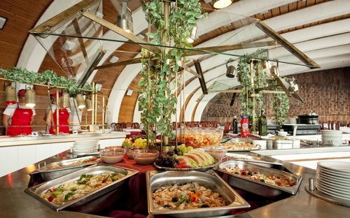polopenze – snídaně a večeře formou bufetu, bohatý výběr, k večeři voda a nealkoholické nápoje v ceně, k večeři víno a pivo