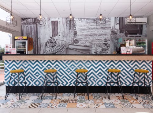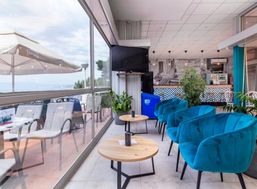 pláže s betonovými platy s přímým vstupem do moře. Dětská část je písková s pozvolným vstupem do moře. Lehátka a slunečníky jsou k dispozici za poplatek. – cca 50 m