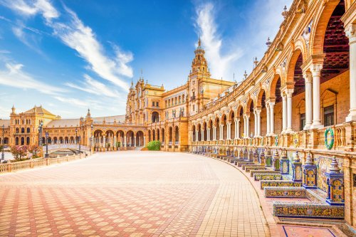 Plaza de España v Seville je ikonické náměstí známé svou architekturou spojující renesanci, baroko a maurský styl.