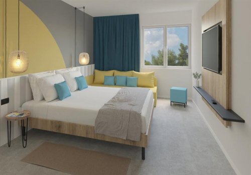 Pokoj o rozměrech cca 16–22 m² je vybaven vlastním sociálním zařízením, manželským lůžkem nebo dvěma oddělenými lůžky, rozkládací pohovkou nebo rozkládacím lůžkem, LCD TV, fénem, trezorem, klimatizací a WiFi připojením. Pokoj není vybaven balkonem. Orientace na mořskou stranu neznamená výhled na moře.