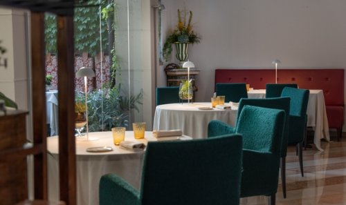 restaurace s velkými okny směřujícími do zahrady se nachází v srdci