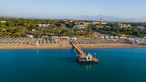 Rozlehlý komplex je vsazen do udržovaných travnatých zahrad se vzrostlými palmami a borovými háji s jezírky. Tvoří jej členitá hlavní 6podlažní budova, areál soukromých vilek a bungalovů a velký spletitý bazénový areál v přední části, která přechází k pláži (hotelu náleží o délce 200 m). Uvítá Vás velká elegantní vstupní hala s recepcí, lobby a výtahy. K dispozici Vám bude pestrá škála společných prostor a služeb: směnárna, bankomat, celkem 5 konferenčních a zasedacích místností různých velikostí, business centrum, salónky, herna, společenské místnosti, nákupní arkáda, kadeřnictví, diskotéka, noční klub aj. Zajisté Vás potěší hotelové Spa a wellness centrum s vnitřním bazénem pro dospělé (252 m2) a pro děti (8 m2), vířivkou, saunou, tureckou lázní a nabídkou široké škály masáží, kosmetických a revitalizačních procedur. Nechybí výtečně vybavené fitness centrum. Stravovací služby obstarávají: hlavní velká restaurace Sofra s vnitřní i venkovní částí a s dětským sektorem a dalších 5 a´la carte tematických restaurací (mexická, asijská, italská, turecká, rybí). K posezení u kávy a nápoje Vám poslouží celkem 7 barů a kavárna (lobby, disco, pool, plážový, snack aj.). Rozlehlá venkovní část (přes 4000 m2) je protkaná bazény s ostrůvky a přemostěními a nabízí: hlavní bazén (1 400 m2), dále relaxační a animační bazén (687 m2 a 540 m2), celkem 3 samostatné dětské bazény (12, 89 a 380 m2) a aquapark se skluzavkami a tobogány pro dospělé i pro děti (212 m2). Sluneční terasy jsou rozseté v zahradách a kolem bazénů, mají slunečníky a lehátka (v ceně, rovněž na hotelové pláži, pavilónky za poplatek). K aktivnímu odpočinku budete mít k dispozici dlouhou řadu možností: tenis (4 kurty), squash, bowling, minigolf, volejbal, basketbal, minifotbal, stolní tenis, šipky, kulečník, lukostřelbu, herny aj. Resort pořádá nespočet denních i večerních animačních programů (pro děti i dospělé: soutěžní, sportovní, zábavní, různé kurzy jako jóga, pilates aj.). Nechybí společenské večery s vystoupeními a diskotékou. Pro nejmenší hosty je zde dětský klub s celodenním programem a aktivitami. Na pláži budete moci využít služeb střediska vodních sportů, plážový volejbal aj.