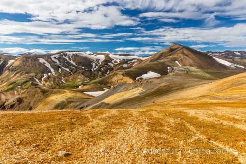 4. denTrasa začíná stoupáním na čelní val Laugarhraun velice husté černočerné lávy protkané spletí ovčích pěšinek a lávy s obsahem obsidiánu – z okolních barevných kopečků vyvěrá pára, vroucí vřídla a teplé potoky (fumaroly), což dokresluje úchvatnou scenérii celé oblasti; kolem nejbarevnější islandské hory Brennisteinsaldy (855 m) pokračujeme do srdce liparitových hor – ráz krajiny se mění co pár kilometrů a černá poušť se střídá se sněhovými poli a zeleným údolím; cestu si zpestříme zdoláním několika brodů ledovcových řek; závěrečný sestup k jezeru Áalftavatn – krajinu zaplaví tufové hory a dlouhé písčité naplaveniny (21 km / ↑650 m / ↓600 m / 8 h).