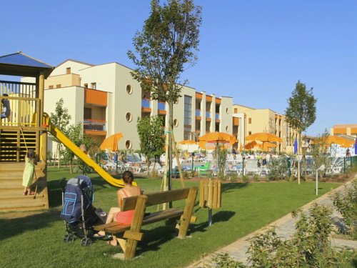 Oblíbená residence leží nedaleko obchodní galerie s butiky a restauracemi. Na soukromém pozemku je k dispozici velký bazén a dětský bazén, solární terasa s lehátky a slunečníky, dětské hřiště, společný gril, kryté (pro apartmány typu residence) a nekryté parkoviště, ve společných prostorách a u bazénu je Wi-Fi. Pro děti jsou pořádány animace. Klientům je k dispozici zdarma vláček na pláž (vzhledem k mimořádné situaci může být provoz vláčku dočasně pozastaven).
