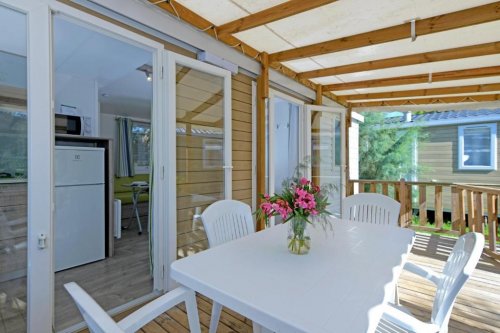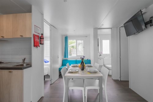 Mobilhome o velikosti cca 24 m2 disponuje vlastním sociálním zařízením, obývacím pokojem s kuchyňským koutem, dvěma oddělenými ložnicemi, topením, klimatizací, SAT/TV, lednicí a terasou s posezením. Domácí mazlíček povolen na vyžádání. Maximální obsazení jsou 4 dospělé osoby a 1 dítě do 9,99 let.