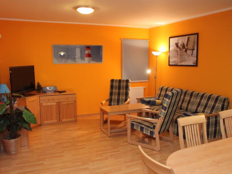 3-pokojový byt 65 m2 v 1. patře. Komfortní a moderní zařízení: obývací pokoj/jídelna 35 m2 s TV-satelit, video, rádio, CD, stereo přehrávač a DVD. 1× pokoj s 1× lůžko a 1×2 lůžka nad sebou. 1× pokoj s 1× lůžko a 1× dvoulůžko. Kuchyňský kout (4 plotýnky, trouba, myčka, mikrovlnka, mraznička, elektrický kávovar) s bar. Koupelna/WC s rohovou vanou. Topení. Pěkný výhled na jezero a na bazén. K dispozici: pračka. Internet (Wireless LAN [WLAN], zdarma). Pozor prosím: byt orientace na ulici.