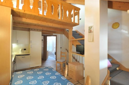 postel, sociální zařízení s vanou, bez balkonu; dvoupatrový apartmán ve