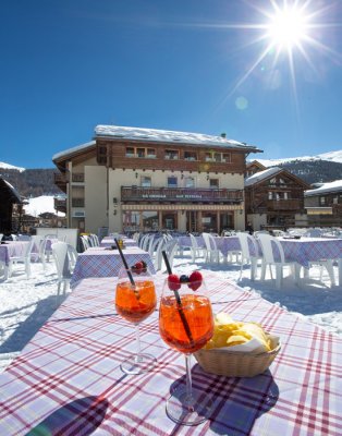 v centru Livigna, lyžařská škola hned za budovou – odtud napojení na
