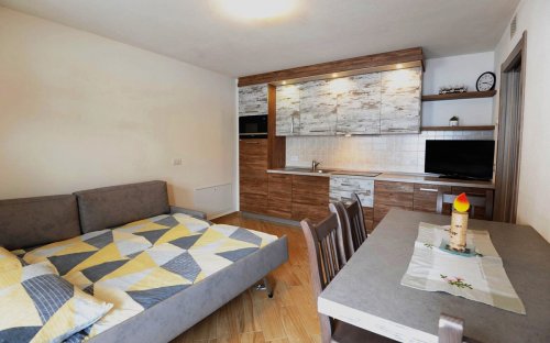 2 samostatnými lůžky, obývací pokoj s kuchyňským koutem a rozkládacím