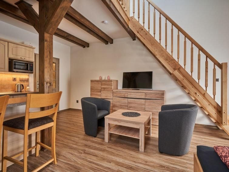 „Na Pomezkách“, 2-pokojový byt 45 m2 na 2 podlažích v 1. patře. Světlé, velmi pěkné zařízení se dřevem: otevřený obývací pokoj/jídelna s 1× dvoulůžko, jídelní stůl a TV-satelit (plochá obrazovka). Kuchyňský kout (4 plotýnky – sklokeramická deska, mikrovlnka, elektrický kávovar). Sprcha/WC, hydromasážní sprcha. V horním patře: zkosená galerie, bez skříně s 2× lůžko. Nádherný panoramatický výhled na krajinu. K dispozici: vysoušeč vlasů. Internet (Wireless LAN [WLAN], zdarma). Pozor prosím: nekuřácký byt. Bez výtahu.
