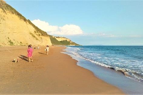 Krásná mnohakilometrová pláž s jemným pískem se táhne od chráněné přírodní lokality u slaného jezera Korission s písečnými dunami, přes letovisko Agios Georgios, liduprázdnou částí pod pískovcovými srázy, až k letovisku Santa Barbara. Vstup do vody je pozvolný, moře otevřené (mohou se tvořit větší vlny), voda je průzračná a čistá.