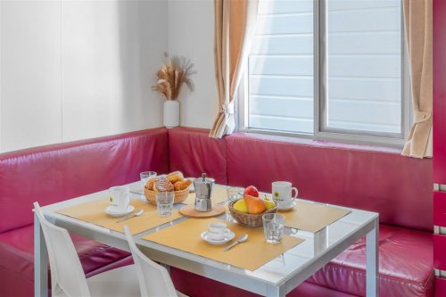 Mobilhome o velikosti cca 20 m² se skládá z ložnice s manželským lůžkem a obývací části s kuchyňským koutem a pohovkou pro 1 osobu, vlastního sociálního zařízení a verandy. K vybavení patří klimatizace (10 hodin provozu denně zdarma) a Sat/TV. Domácí mazlíčci povoleni na vyžádání u CK za poplatek. Maximální obsazenost mobilhomu jsou 3 dospělé osoby.