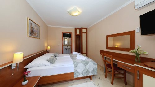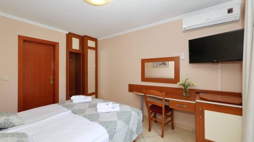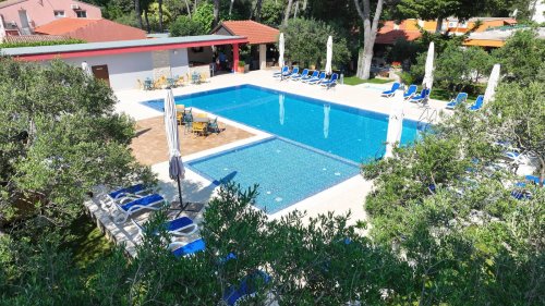 pokoje v kamenných bungalovech s malou terasou a posezením. Dvoulůžkové pokoje standard a superior (větší) s možností 3. a 4. lůžka/ přistýlky (4. lůžko může být vysunovací), s koupelnou a WC, TV, wifi a klimatizací, nad rámec obsazenosti lze dítě do 3,9 let bez lůžka zdarma na vyžádání. Na vyžádání propojené pokoje pro 4 osoby a rodinné pokoje mají 2 ložnice (lze pro 4+2 osoby).