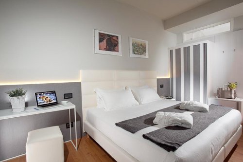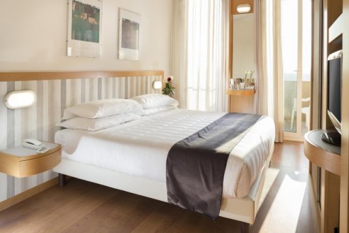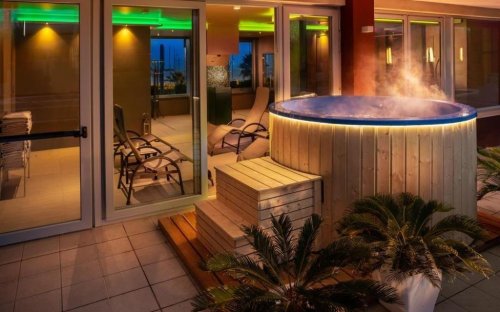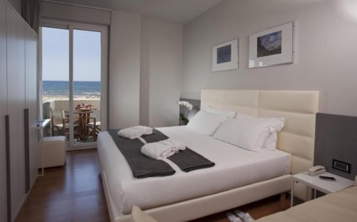 Stylový hotel s výhledem na moře se nachází hned u pláže, mezi letovisky Rimini a Riccione, pouze cca 1 km od letiště. Elegantně zařízený hotel nabízí prostorné interiéry, kde je pozornost věnována každému detailu. Mezi vybavení hotelu patří recepce otevřena nonstop, restaurace, bar, výtah, zahrada, terasa, společenská místnost s TV, WiFi připojení v celém hotelu zdarma, garáž za poplatek, soukromé parkoviště zdarma (omezená kapacita, nelze rezervovat). Dále hotel disponuje venkovním bazénem s mořskou vodou, slunečníky a lehátky, či vířivkou zdarma. Ve vnitřní části můžete relaxovat ve wellness centru za poplatek, které je vybaveno tureckými lázněmi, zážitkovými sprchami, finskou saunou, vířivkou, soláriem a čajovým koutkem. Za poplatek lze využít i masáže (info a rezervace na recepci). Nebudou se nudit ani děti, protože na ně čeká dětské hřiště, dětský koutek, dětský bazén, či miniclub na pláži (dle dostupnosti na místě). Pobyt s domácími mazlíčky (malé plemena psů) povolen na vyžádání u CK za poplatek dle ceníku hotelu na místě. Hotel akceptuje platební karty Visa, Mastercard a American Express.